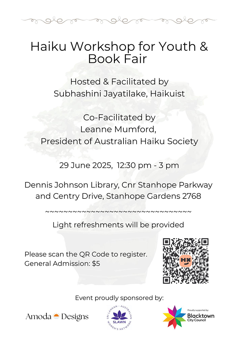 FreeThis is a workshop for beginners who are interested in haiku poetry. There are haiku and other poetry books on sale if the attendees are interested to buy.