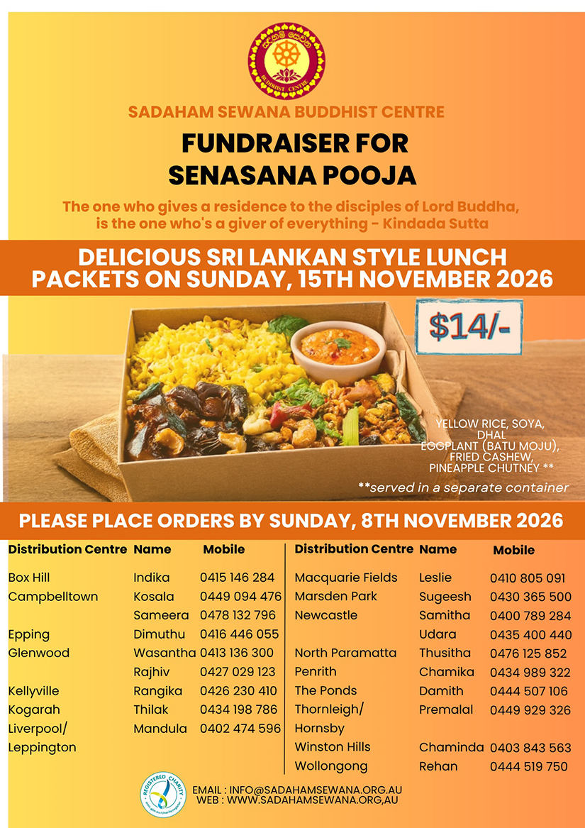 Sadaham Sewana Buddhist Centre is a part of Galduwa Forest Tradition established with the noble intention of spreading the teachings of the supreme Buddha and allowing the community in Sydney to engage in mindfulness activities leading to liberation from Samsara Dukka.